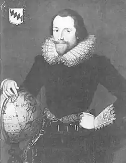 In making his terrestrial globes, Molyneux examined ruttiers (instructions for directions at sea)[10] and pilots (navigational handbooks).[11] He is known to have given a ruttier for Brazil and the West Indies to Thomas Harriot in 1590.[7][12] He also received advice and assistance from navigators and mathematicians.[13] It is likely, for instance, that Sir Walter Raleigh advised him on a legend in Spanish about the Solomon Islands that appeared on the terrestrial globe.[14] Raleigh came by the information from Pedro Sarmiento de Gamboa, a Galician explorer sent by King Philip II of Spain to fortify the Strait of Magellan after Francis Drake had passed through it. In 1584, the Spaniard was Raleigh's guest in London for a few weeks, after being captured by Raleigh on a journey to Europe.[15]