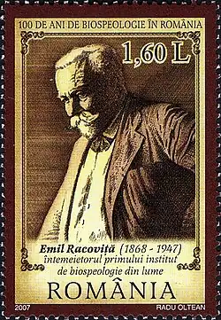 Poșta Română issued several stamps in his honor: 55 bani and 1.20 lei stamps in 1958, a 55 bani stamp in 1968, a 4 lei stamp in 1985, a 2 lei stamp in 1986, a 4.50 lei stamp in 1997, and a 1.60 lei stamp in 2007. The last one is part of a series of four stamps (Scott 4911–4914) commemorating 100 years since the foundation by Racoviță of the first biospeleology institute in the world.