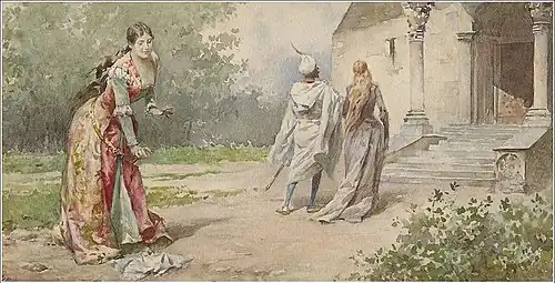 In 3.1, Cassio asks Emilia to allow him to privately confer with Desdemona, which she does. She finds Desdemona's handkerchief in 3.1 and gives it to Iago, who swears her to secrecy. Despite her involvement in the handkerchief's disappearance, she comforts Desdemona when Othello becomes enraged after discovering that it is missing in 3.4.[1]