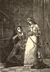 In 1870, Sartain met Mary Cassatt in Philadelphia and the following year they left for Paris, London, Parma, and Turin to study painting.[18] The women spent the first winter in Italy[10] and studied printmaking with Carlo Raimondi, who taught engraving at the Academy of Fine Arts in Parma.[18] Sartain spent the rest of the four-year stay in Paris[10] and studied under Évariste Vital Luminais.[2] She shared a studio with Jeanne Rongier. Florence Esté, Sartain's friend, also worked in the studio occasionally. The women copied each other's work and provided one another with criticism and encouragement.[19] Two of Sartain's paintings, a genre painting Le Piece de Conviction (The Reproof) and a portrait of Mlle. Del Sarte, were accepted at the Paris salon in 1875.[18][20] Sartain returned to the United States that year,[18][a] when she ran out of money. Harriet (Hattie) Judd Sartain, who was her brother Samuel's wife and a successful homeopathic physician, had lent Emily Sartain money for her education. Emily believed Hattie was likely to continue to help with education expenses in Philadelphia where expenses were lower and she would more likely sell her works.[22]