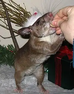 Both the Gambian pouched rat and Emin's pouched rat were introduced into the exotic pet trade. Unfortunately, many dealers and breeders failed to recognize the difference in the two species and some even tried breeding the two together. There have been reports of it being successful, and other reports of offspring dying at birth. Both species are sometimes kept as pets, but males can be territorial to others of the same species.