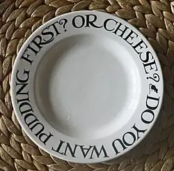 Emma Bridgewater is a British ceramics manufacturing company founded in 1985. The company specialises in earthenware tableware, manufactured in Stoke-on-Trent, England.[1][2][3][4] The pottery is produced using traditional techniques.[5] The company is one of the largest pottery manufacturers based entirely in the UK.[6]