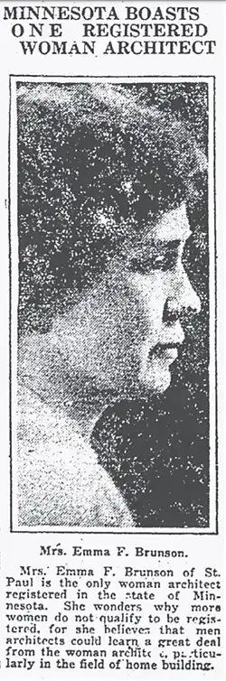 - ^ a b Troute-Oertel, Diane (Fall 2007). "Emma F. Brunson: The first woman registered as an architect in Minnesota" (PDF). Ramsey County History. Vol. 52, no. 3. Ramsey County Historical Society. p. 15. ISSN 0485-9758. Archived (PDF) from the original on 15 July 2021.