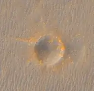 Emma Dean is a small impact crater in the Meridiani Planum extraterrestrial plain situated within the Margaritifer Sinus quadrangle (MC-19) region of the planet Mars. This geological feature was visited by the Opportunity rover from sols 929 to 943. The much larger crater Victoria lies about 100m to the east. Emma Dean lies directly on top of the ejecta blanket from Victoria and could therefore expose material originating from deep inside Victoria. The crater is named after Emma Dean, John Wesley Powell's wife and one of the boats in Grand Canyon Powell expedition.[1][2][3]