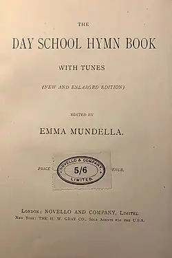 Emma Mundella’s most important work, however, by which she will be remembered, is The Day School Hymnbook (Novello and Company, London, 1890). The first edition, published in 1890, contained 83 hymns. The Musical Times reported that it was remarkably well-received and reviewed and proved her to have the sort of skill in selecting words and music which would win the hearts of the young.[11] Novello and Company requested her to enlarge the scope of her work and make the second issue much more comprehensive.[11]