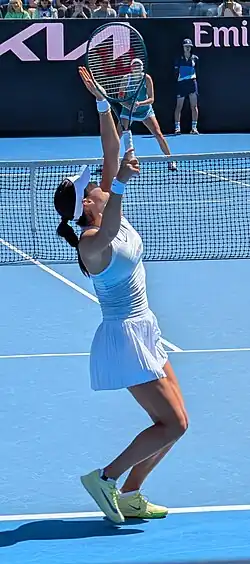 Raducanu was scheduled to start her 2025 season at the Auckland Open but withdrew due to a back injury.[193] Her first competitive match of the year was at the Australian Open, defeating 26th seed Ekaterina Alexandrova in two sets that both went to tiebreaks.[194] Raducanu then overcame Amanda Anisimova in straight sets to reach the third round at this major for the first time.[195][196] She lost to second seed Iga Świątek, in straight sets.[197]