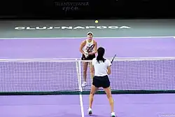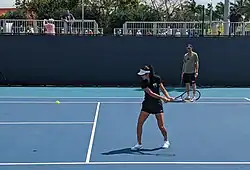 Raducanu's season continued with a straight-sets victory against Marie Bouzková at the Abu Dhabi Open, losing to Ons Jabeur in the second round.[155] A lacklustre performance followed at the Qatar Ladies Open, where Raducanu lost to Anhelina Kalinina, being served a bagel in the first set.[156] She did not play until the Indian Wells Open where she reached the third round for the first time since the 2023 edition of the event, beating qualifier Rebeka Masarova and 30th seed Dayana Yastremska who retired four games into the first set.[157] She lost to second seed Aryna Sabalenka in the third round, marking her sixth loss against a top-10 player.[158] Raducanu received a wildcard into the main draw of the Miami Open, but withdrew before her scheduled first-round match against Wang Xiyu, citing a lower back injury.[159]