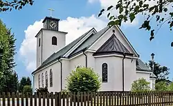 Emmaboda Church (Emmaboda kyrka) was built in 1926 after drawings by architect Göran Pauli (1891-1940) and was originally a parish home. In 1941, a remodeling was carried out, after drawings by architect Paul Boberg (1884-1947) when the parish home was converted to church. The tower and the current choir party were then added. The altarpiece is painted by artist Gunnar Theander (1894-1975) in 1935. The bell tower houses two bells which were cast by the foundry, Bergholtz klockgjuteri.[9][10] [11] [12]