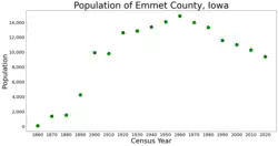 - ^ "P2 HISPANIC OR LATINO, AND NOT HISPANIC OR LATINO BY RACE – 2020: DEC Redistricting Data (PL 94-171) – Emmet County, Iowa".