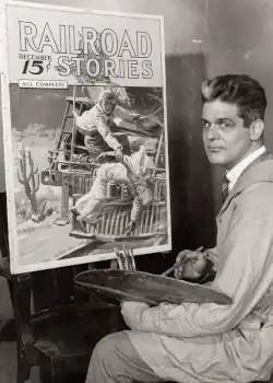 His art includes covers for Adventure, American Legion Weekly, Argosy, Big Chief Western, Capper’s Farmer, Colliers, Detective Dime Novels, Detective Fiction Weekly, Double Detective, Everybody's, Farmer's Wife, Good Hardware, Judge, Leslie's, Liberty, Life, National Home Monthly, Parents’ Magazine, People's Popular Monthly, Phantom Detective, Progressive Grocer, Railroad Stories, Red Star Detective, Saturday Evening Post, Star Western, Thrilling Adventures, and Toronto Star Weekly.[9] In addition, he drew magazine interior art and advertisements; hunting, fishing, and camping scenes for calendars for Brown & Bigelow; and illustrations for book jackets.