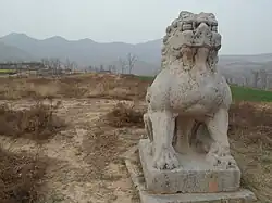 After Chang'an was recaptured from Yan forces in 756, Li Chu (whose name was then changed to Li Yu) was made crown prince, and in 762, after Emperor Suzong's death, he became emperor (as Emperor Daizong).[9] Emperor Daizong gave Li Kuo the title of supreme commander of the armed forces and created him the Prince of Lu, a title soon changed to Prince of Yong.[10] He and his staff were sent to rendezvous with Tang and ally Huige forces at Shan Prefecture (陝州, in modern Sanmenxia, Henan), to prepare an attack to recapture the eastern capital Luoyang, which was then serving as the Yan capital under Yan's fourth and final emperor Shi Chaoyi. When Li Kuo met Huige's Dengli Khan Yaoluoge Yidijian (藥羅葛移地健), he treated Yaoluoge Yidijian as an equal, drawing Yaoluoge Yidijian's anger (as Tang was highly reliant on Huige aid at that time). Yaoluoge Yidijian had Li Kuo's Yao Ziang (藥子昂), Wei Ju (魏琚), Wei Shaohua (韋少華), and Li Jin (李進) arrested and whipped severely, such that Wei Ju and Wei Shaohua died that night. Yaoluoge Yidijian did not harm Li Kuo, but sent him back to the Tang camp.[9] This incident would cause Li Kuo to bear great hatred for Huige later.[11] After Luoyang was recaptured and Shi Chaoyi committed suicide in flight in 763, Li Kuo was given the chancellor title of Shangshu Ling (尚書令), and his portrait, along with those of eight generals (including Guo Ziyi), were added to the Portraits at Lingyan Pavilion.[12] Subsequently, during a Tibet incursion in 763 in which Emperor Daizong was forced to flee Chang'an and Tibet forces briefly captured Chang'an, Li Kuo was named the titular supreme commander of forces in the Guanzhong region (i.e., the Chang'an region), but the general Guo Ziyi, as deputy supreme commander, was actually in command.[13]