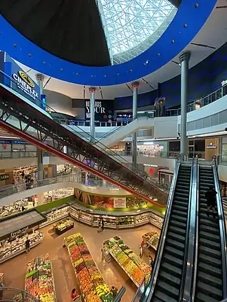 The podium of the complex is a three-storey retail mall. It covers 240,000 square feet (22,000 m2) topped with a 95 feet (29 m) dome, that highlights one of the longest unsupported escalators in North America to give access to the movie theatre from the ground floor. There is a 3,035-seat Cineplex Cinemas movie multiplex featuring a state of the art IMAX Theatre. The lowest level has underground access to the North York Centre subway station.
