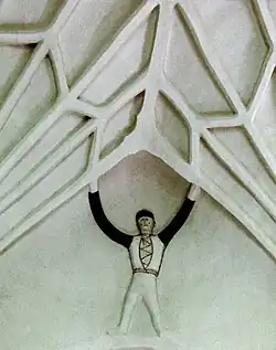 The exterior of the church is characteristically neo-Gothic. The entrance is through the copper-clad and corbie stepped western tower. Inside, the nave is still dominated by its medieval vaults, some of which are decorated with fragmentary remains of frescos.[2] Some of the frescos, depicting the Veil of Veronica,[5] were made by the so-called Tierp group or master.[6] There are also remaining frescos in the vault, so-called "vault men".[6][7] The pews are reconstructions of pews from church dating from the 17th century, made during the 1955 renovation. Two decorative pyramids (17th century) adorn the front pews.[2] Some medieval furnishings still survive as well: the baptismal font is from the 13th century (and thus probably older than the church), and there is a wooden statue of Saint Bridget of Sweden from the 15th century.[3] A triumphal cross from the 13th century, altered in the 15th century, also survive in the church, as do the medieval altarpiece, although some of its figures have been lost. It is probably made by a Swedish craftsman and shows influences from northern German art.[2] The pulpit is from 1708,[2] and the church was adorned with new stained glass windows by artist Julia Lüning in 1955.[3]