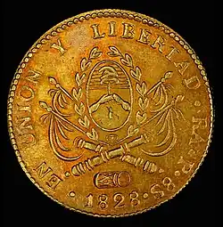 En unión y libertad (Spanish for "in unity and freedom") is Argentina's national motto.[1][2] It appeared for the first time on the earliest Argentine gold and silver coins, as established by the 1813 General Assembly[3] during the War of Independence of the United Provinces of the Río de la Plata from the Spanish Empire. The motto is considered to be a reference to the ideals of French Revolution.[4]