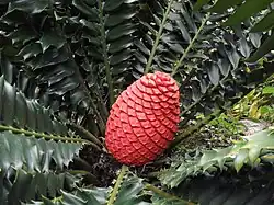 E. ferox is reported to grow relatively fast compared to members of other cycad genera, but are considered slow-growing when compared to other orders and classes.[3] E. ferox reproduces using cones that are of a dark salmon color, as opposed to the greenish coloration typical of other cycads.[7] It shares this coloration with E. gratus, although the two species likely evolved this condition independently.[6] The cones are sexually dimorphic: the male cone is a 40 to 50 cm long cylinder that is 7 to 10 cm wide with a peduncle that is up to 2 to 3 cm long; the female cone is 25 to 50 cm long, 20 to 25 cm wide, and sessile. Males can have up to ten cones at one time and females can have up to five cones at one time.[3] The cones also emerge in succession, rather than emerging simultaneously.[8] The shields of the megasporophylls are pyramidal shaped, with flattened facets.[3] The seeds, which are about 4.5 to 5 cm long and 1.5 to 2 cm wide, are red, narrow, oblong and glossy.[4]