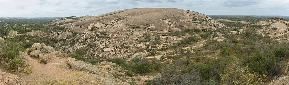 The prominent granite dome is visible for many miles in the surrounding basin of the Llano Uplift. The weathered dome, standing above the surrounding plain, is known to geologists as a monadnock. The rock is actually only the visible above-ground portion of a segmented ridge, the surface expression of a large igneous batholith, called the Town Mountain Granite,[9] of middle Precambrian (1,082 ± 6 million years ago)[10] material that intruded into earlier metamorphic schist, called the Packsaddle Schist.[9] The intrusive granite of the rock mass, or pluton, was exposed by extensive erosion of the surrounding sedimentary rock, primarily the Cretaceous Edwards limestone that is exposed a few miles to the south.[9]