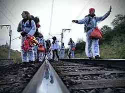 On the 27 October 2018, a bucket-wheel excavator near the village of Morschenich as well as the rails of the Hambach industrial spur belonging to the Hambach surface mine were occupied by several thousand activists for 22 hours in order to symbolically block the transfer of lignite to the power plants.[2] More than 5000 people took part in the protests.[3]