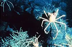 The main invertebrate found in these areas is the tubeworm (Ridgeia piscesae), which has a “short fat” morphology when it is in high flow areas near the vents, and a 'long skinny' morphology when in low flow areas farther away from the vents.[23] The dominating invertebrate species that have been recorded are spider crabs (Macroregonia macrochira), sulphide worms (Paralvinella sulfincola), limpets (Lepetodrilus), polynoid scaleworms, and palm worms (Paralvinellae palmiformis) that belong to the Alvinellidae family.[18] Furthermore, symbiotic vent bacteria provide nutrients to the animals living there through the process of chemosynthesis since no sunlight reaches the depths of the Endeavour vent fields.[27][28]
