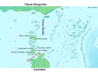 ![]() A map of the Torres Strait Islands, with the Endeavour Strait located south of Prince of Wales Island (Muralug) in the Torres Strait | |