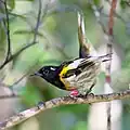 stitchbird, hihi | Notiomystis cincta | bird | New Zealand | Historically common across New Zealand, by the 20th century had become restricted to Little Barrier Island. Since 1991, the species has been reintroduced to islands and sanctuaries.[33] |