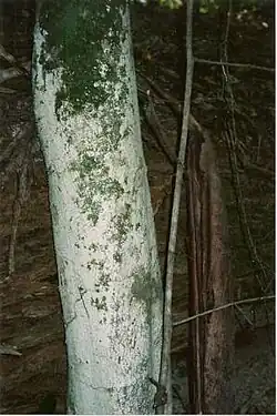 A small tree, often with coppice shoots at the base. New leaves pinkish brown. The bark is pale to dark grey. Leaves are elliptic to narrow-elliptic, 5–15 cm long, 2–5 cm wide.