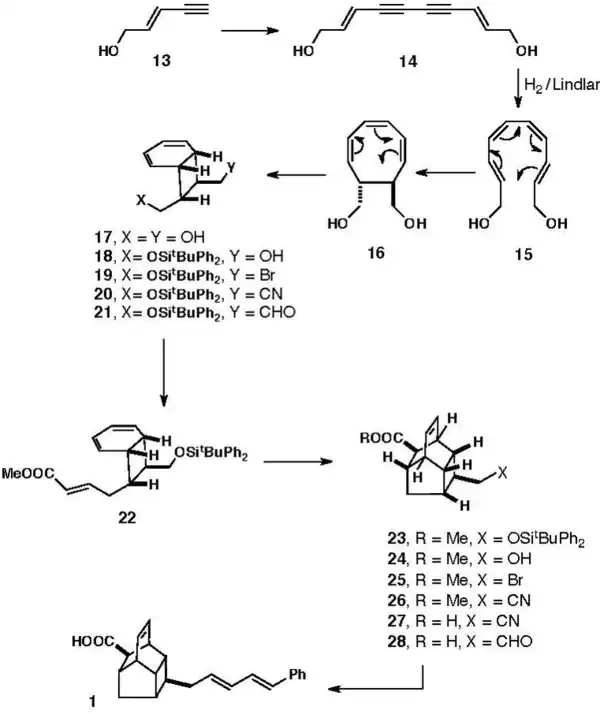 The title compound was then pursued via DIBAL reduction of the nitrile at low temperature, followed by mild acidic hydrolysis to release aldehyde 21. A series of 7 further steps—condensation to form trans-butenoate 22, thermal intramolecular Diels-Alder reaction to create the tetracyclic endiantric core structure 23, desilylation to unmask alcohol 24, bromination and nitrile formation (as described above) to give 25 and 26, respectively, then hydrolysis of the methyl ester and repeat of the earlier DIBAL/acid hydrolysis sequence—generated the endiantric core structure with pendant aldehyde, 28, that was poised for the final step. Its treatment with diethyl cinnamylphosphonate and LDA at low temperature in THF (generating en route the anionic olefination reagent) formed the desired diene in good yield in a "geometrically controlled manner", thus providing the desired endiandric acid C product.