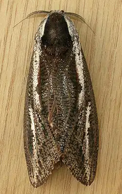 The adult moth is large (it has a wingspan of about 16 cm), with a fine mottled grey pattern and rusty red base on its wings. The moth has degenerate mouthparts, and is unable to feed itself, relying solely on nourishment obtained during its larval phase.[2]