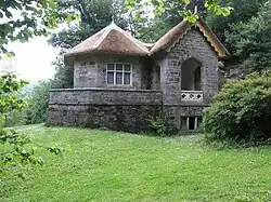 The landscaping was designed by Humphry Repton and the grounds originally comprised a plantation of 300 acres, including a thickly wooded slope going down to the river, and gardens of 20 acres. The buildings in the grounds include the Shell Grotto, a polygonal summer-house and the Swiss Cottage, restored by the Landmark Trust with a thatched roof. Also, the Dairy Dell, by Repton, Pond Cottages by a pool and the octagonal Dairy surrounded by a loggia, and the Holy Well, part of which is an ancient structure formerly situated at Leigh Barton, and used as the baptismal font of the hunting seat of the Abbots of Tavistock Abbey.[8] The following structures as well as the main house are Grade I listed: Rockery and Grotto, Stables, Salmon Larder and Ice House, Shell House and Grotto.