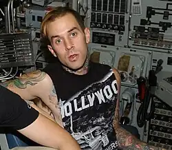 Desperate for a break, the overworked band began to argue and tensions formed.[5] Raynor, who was at the center of this drama, had been commenting of his desire to attend college for years, and had been taking homework out with him on tour to try and complete his high school diploma.[8] The tension came to a head in February 1998 as the band embarked on SnoCore, described as "a winter version of the Warped Tour." Sharing the stage with Primus, the band was enjoying more success than ever before, but the drama between the musicians had grown substantially.[6] The band reached a low point when the band engaged in a fight on a Nebraska date after SnoCore's conclusion.[9] Raynor would depart following SnoCore,[6][10] and the ensemble recruited Travis Barker, drummer for the opening ska punk group The Aquabats, to fill in for Raynor. Barker, who had not had time to prepare or practice with the duo, learned the drum tracks for the 20-song setlist in only 45 minutes before the first show and performed them flawlessly thereafter.[11][12] "I remember Travis rehearsing backstage for an hour or two, then playing with them during sound-check," said Adam Deibert of the Aquabats. "A few of us were standing behind the stage and vividly remember the feeling of this is the new Blink. We should have looked for a new drummer right then because it was obvious what band he belonged in."[13] Shortly thereafter, the band embarked on a short minitour along the western coast, most notably Southern California, the band's favorite place to play. The tour ended with the band headlining a sold-out show at the Palladium in Hollywood, California, where the band had dreamed of performing for years.[14] Raynor returned for the band's Palladium performance, but the band became increasingly uneasy and arguments grew worse.[11] To offset personal issues and a "tragic loss," Raynor began to drink heavily and it began to affect the band's performances.[15][16]