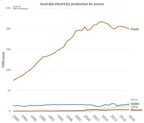 In 2023, Australia’s energy consumption increased for the first time in four years and energy use in electricity supply decreased as coal generation continues to fall.[2] With a rebound in activity post COVID-19, transport and commercial energy use increased.[2] As of 2023, Australia remains heavily reliant on fossil fuels, particularly coal, for electricity generation. In 2023, coal accounted for 46% of Australia's total electricity generation, down slightly from 47% in 2022.[3] In the 2022–23 financial year, oil sources contributed to approximately 38.9% of Australia's total energy consumption.[3] The 2022–23 financial year set a record for Australia’s clean energy supply. Australia has one of the fastest renewable energy deployment rates worldwide. The country deployed 5.2 GW of solar and wind power in 2018 and has significantly increased its renewable energy capacity since. During the 2022-23 year, renewable energy generation increased 11%, accounting for 34% of Australia’s electricity generation- 16% from solar, 12% from wind, and 6% from hydro—the highest share recorded to date. Solar power generation grew 21% in the 2022–23 year and is 11 times higher than a decade ago.[2]