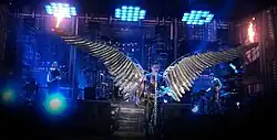 When performed on stage, flames were shot into the air, and Schneider's drumsticks would shoot sparks. In the "Live aus Berlin" shows, Bobo joined Rammstein to sing her parts from inside a flaming cage, instead of the usual pre-recorded chorus used in most of the shows. Having been excluded in the entire Reise, Reise tour, "Engel" returned to the setlists as the closing song of the Liebe ist für alle da tour, taking place during 2009 and 2011. This time around, vocalist Till Lindemann sang the chorus instead of Bobo's pre-recorded lines. For the pyrotechnics, Lindemann wears a set of angel wings that shoot flames from the tips and have sparks go off along them.[2] "Engel" was the penultimate song on the setlist during the Made in Germany 1995-2011 tour, and the tour in 2016.