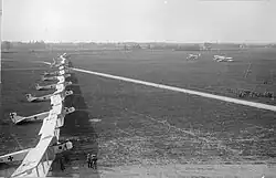 Having received a favourable weather forecast for the following day, 25 May, Brandenburg issued orders for the first Gotha attack on London. Twenty-three bombers took off at 2 pm and refuelled at Nieuwmunster near Zuienkerke on the Belgian coast, so that they had enough fuel to approach by a circuitous route over the North Sea. One aircraft dropped out with engine failure almost immediately and another turned back near the English coast.[16] On the approach to London it was found that there was a thick cloud cover over the whole area and so on the return route, the coastal town of Folkestone and the army camp at Shorncliffe were attacked. There was no warning given to those on the ground and casualties totalled 95 dead and 195 injured,[17] including many women and children who had been queuing outside shops in Tontine Street.[18] British opposition, equipped and organised to oppose nocturnal airship raids, had been largely ineffective; Sir John French, who was in overall command of home defence, had previously ordered that only coastal anti-aircraft guns could fire at hostile aircraft, and although 70 fighters had taken off, only two actually sighted the bombers. However, RNAS fighters from Dunkirk intercepted the returning formation and shot down one into the Channel, while another crashed on landing.[19] Retaliatory British raids were made on the airfield at Saint-Denijs on 28 May and 4 June but caused little damage..[20] On 5 June, a second raid on London was rerouted before takeoff to Sheerness Dockyard because of a bad weather forecast; one Gotha was shot down into the Thames Estuary by anti-aircraft fire.[21] Several small vessels were sunk in the docks and an ammunition store exploded; 13 were killed and 34 wounded, mostly military personnel.[22]