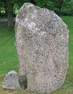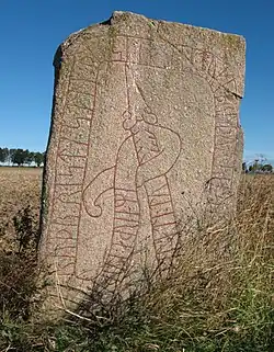 This stone is notable because it commemorates that the Viking Ulf of Borresta had taken three danegelds in England.[9] The first one was with Skagul Toste in 991,[11] the second one with Thorkel the High in 1012[11] and the last one with Canute the Great in 1018.[11] Since there were many years between the danegelds, it is likely that Ulfr returned to Sweden after each danegeld to live as a wealthy magnate.[12][13]