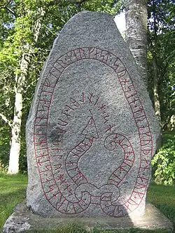This secluded runestone is located in a grove near Väsby, Uppland, Sweden. It was raised by a Viking in commemoration of his receiving one danegeld in England. It is classified as being carved in runestone style Pr3 and, together with U 344, it has been said to be the earliest example of an Urnes style inscription in Uppland.[5] The runic text follows a common rule to only carve a single rune for two consecutive letters, even when the letters were at the end of one word and the beginning of a second word.[6] When the text shown as Latin characters, the transliterated runes are doubled and separate words are shown. For U 194 has three examples where this occurred, þinoftiʀ is transliterated as þino| |oftiʀ, tuknuts as tuk| |knuts, and anklanti as a| |anklanti.