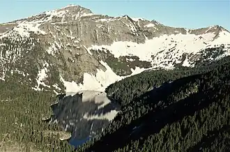 Engle Peak is located 7 miles (11 km) east of Noxon, Montana, along the boundary of the Cabinet Mountains Wilderness, on land managed by Kaniksu National Forest.[2] It is set west of the Continental Divide in the Cabinet Mountains which are a subrange of the Rocky Mountains.[1] Precipitation runoff from the mountain's south slopes drains to McKay Creek, whereas the north slope drains into Engle Lake and Rock Creek, and both creeks are tributaries of the Clark Fork River. Topographic relief is significant as the summit rises 1,500 feet (460 m) above Engle Lake in one-half mile (0.8 km). Engle Lake is named after pioneer Isaac Engle (1855–1928) who homesteaded nearby.[5] Engle Peak is named after Roy Engle of Noxon who saved the lives of 25 crewmembers fighting a 1910 forest fire.[6][7] The mountain's toponym has been officially adopted by the U.S. Board on Geographic Names,[3] and has appeared in publications since 1875.[8] An ascent of the summit involves hiking 3.9 miles with 3,489-feet of elevation gain on the Engle Peak Trail.[4]