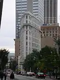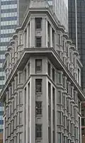 The English-American Building, commonly referenced as the Flatiron Building, is a building completed in 1897 located at 84 Peachtree Street NW in downtown Atlanta, Georgia, on the wedge-shaped block between Peachtree Street NE, Poplar Street NW, and Broad Street NW. It was completed five years before New York's Flatiron Building, and shares a similar prominent flatiron shape as its counterpart. It was designed by Bradford Gilbert, a Chicago school contemporary of Daniel Burnham, the designer of the New York building. The building has 11 stories, and is the city's second and oldest standing skyscraper. The Flatiron building is protected by the city as a historic building in the Fairlie-Poplar district of downtown, and is listed in the National Register of Historic Places.[5]