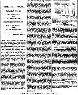 - J Darling, FA Iredale, JC Reedman, CE McLeod and E Jones (all AUS), and AC MacLaren, JT Brown, FGJ Ford and LH Gay (all ENG) made their Test debuts.