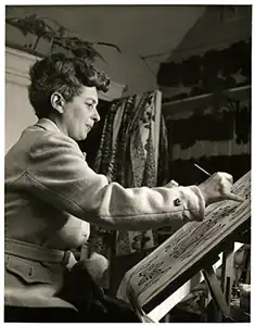 In 1925, after leaving school before finishing her degree, Marx went to work for the textile designers Phyllis Barron and Dorothy Larcher at their studio in Hampstead.[15] In 1927 she started her own workshop where she designed and produced block-printed textiles, often making use of naturally-derived dyes instead of new chemical methods.[4][16] Her work was sold through the Little Gallery, off Sloane Street, and later at Cecilia Dunbar Kilburn's Dunbar Hay gallery.[15] Collectors of her work included the actors Gerald du Maurier and Gertrude Lawrence.[17]