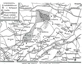 At the outbreak of the Balkan War in 1912, 74 people from Enidze Vardar volunteered in the Macedonian-Adrianopolitan Volunteer Corps.[11] In November 1912, in the Battle of Yenidje, the Greeks inflicted the final defeat on the Ottoman forces in Southern Macedonia, which led to the fall of Thessaloniki. As a result of massive artillery shelling, the Turkish quarters and the barracks in the town were burned down.[12] At the beginning of Second Balkan War, many citizens and revolutionaries were exiled by the new Greek authorities to the island of Trikeri, where they met their deaths.