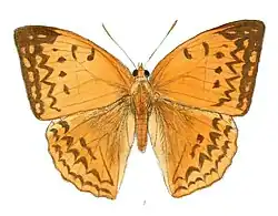 The upperside of both males and females is a rich ochraceous orange. The forewing has a spot along the upper portion of the discocellulars, two fine lunate spots beyond, an erect series of four discal spots, a subterminal zigzag narrow band, the apical portion of the costa, the apex and the terminal margin broadly black. Hindwing: a discal irregular transversely elongate suffused mark and two series of lunular continuous marks beyond black; termen narrowly fuscous. Underside rich bright ochraceous; a broad transverse band across both wings from costa of forewing to the tornus of the hindwing slightly darker ochraceous, defined inwardly by an irregular sinuous and broken, and outwardly by a straighter complete ferruginous line; some ferruginous spots at the bases of the wings, and on the hindwing a discal series of three or four minute dark ocelli, the lowest white centred; outer halves of both forewing and hindwing uniform, the black markings of the upperside showing faintly through. Antennae, head, thorax and abdomen bright ochraceous.[1]