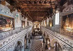 - Enna Cathedral: was built in the 14th century by queen Eleanor of Anjou, the wife of Frederick II of Aragon. It was renovated and remodeled after a fire that occurred in 1446. The great Baroque facade, in yellow tufa-stone, is surmounted by a massive campanile with finely shaped decorative elements. The portal on the right side is from the 16th century, while the other is from the original 14th-century edifice. The interior has a nave with two aisles, separated by massive Corinthian columns, and three apses. The stucco decoration is from the 16th and 17th centuries. Art works include a 15th-century crucifix panel painting, a canvas by Guglielmo Borremans, presbytery paintings by Filippo Paladini (1613), and a Baroque side portal. The cathedral's treasure is housed in the Alessi Museum, and includes precious ornaments, the gold crown with diamonds known as the "Crown of the Virgin," Byzantine icons, thousands of ancient coins, and other collections.
