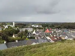 The town's official name is Ennistimon, although Ennistymon is the spelling most widely used.[2] Historically, it was spelt Inishdymon.[2] This is believed to derive from Inis Diomáin meaning "Diomán's island".[2][3] However, Míchéal Ó Raghallaigh argues that the name is derived from Inis Tí Méan meaning "island of the middle house" or "river meadow of the middle house".[4]
