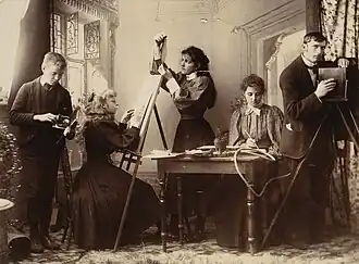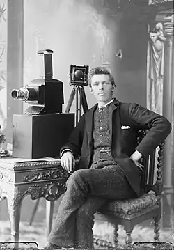 ![]() Pegler in the 1890s, with a lantern slide projector and camera | |