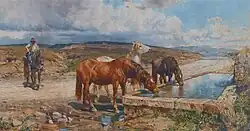 Coleman was initially taught by his father,[3] and either did[4] or did not[5] study at the Accademia di San Luca in Rome. Following the mocking reception of Una mandria di bufali nelle paludi pontine, a naturalistic painting of a herd of buffaloes in the Pontine marshes, at the International Artist's Club in 1872,[2][6] he reportedly began to paint genre subjects in the manner of the then-fashionable Mariano Fortuny, although no works showing the influence of the Spanish painter are known.[7] At the instigation of Nino Costa, he soon returned to the depiction of the people, animals and landscapes of the Campagna Romana and the Agro Pontino.[8][note 2] An album of watercolours from this youthful period (1871–1875) was recently rediscovered and was shown in Rome in 2004.[9]