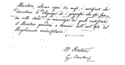 Excerpt from a letter written by the Rector G. Cantoni, dated 18 October 1865: "In seguito al felice esito da lei sortito negli esami (...) per un posto di studio all’estero, il Regio Ministero dell’Istruzione pubblica (...) le ha aggiudicato un sussidio di lire 2400 per un anno, affinchè ella possa perfezionarsi in Vienna nella scienza della Fisiologia e Istologia. (...) I sussidi saranno pagati in dodici rate mensili eguali posticipate".[6]