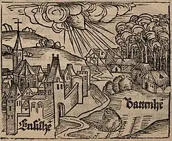The fall of the meteorite, as depicted in the Nuremberg Chronicle from 1493.