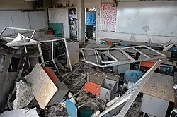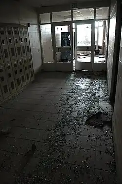 On March 1, 2007, Enterprise High School was hit by an EF4 tornado during the February–March 2007 Tornado Outbreak. The twister collapsed parts of the building's science wing, third hallway and new gym, while causing severe damage in other areas of the school after impacting near Enterprise's municipal airport. The parking lot designated "Blue" was severely damaged, with cars stacked on each other. Cars in the other school parking lots were also damaged. Early news reports indicated that 20% of the building was damaged, and numerous students were injured.[8] reported eight fatalities at the school as of 8:30 p.m. CST on the evening of the storm; earlier reports had set the death toll as high as 22, later scaled back to five. The death toll was increased again the following day to eight as recovery efforts went onward. The final death toll was set at nine, including Ryan Mohler, Peter Dunn, AJ Jackson, Jamie Vidensek, Michael Bowen, Mikey Tompkins, Katie Strunk, Michelle Wilson, and an elderly woman named Edna Strickland.[9] It was the first killer tornado at a US school since 1993.