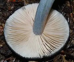 The cap is initially conical later developing an umbo and becoming rounded or bell-shaped, reaching diameter of 1.5–5.5 cm (0.6–2.2 in) in diameter. Older fruit bodies have margins that are turned upward. The cap color is dark brown or soot-brown but always has a bluish tinge. The surface is dry, covered by radially arranged wrinkles or veins, neither striate nor hygrophanous. The gills are adnexed to be almost free from attachment to the stem. They are somewhat distantly spaced, with between 16 and 22 gills extending fully from the stem to the edge of the cap, in addition to one to three tiers of interspersed lamellulae (short gills that do not extend fully from the stem to the cap edge). The gill color is grey-bluish later becoming pink, and the gill edges are straight or somewhat saw-toothed, and the same color as the gill face. The stem is 4–10 cm (1.6–3.9 in) by 0.3–1 cm (0.12–0.39 in), bulbous-rooting or club-shaped. The top portion of the stem is deep blue, the color fading towards the whitish or ochraceous base, strongly fibrillose, dry, hollow, fragile, often twisted. The flesh is blue in the cap and the upper parts of the stem, but whitish or yellowish at the base. The taste and odor of the mushroom are strongly acidulous.[4] The spore print is pink.[2]