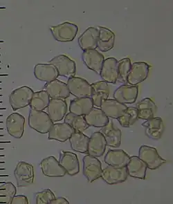 The spores are roughly spherical, with 5–7 blunt angles, and measure 7–9 by 6.5–8 μm. The basidia (spore-bearing cells in the hymenium) are four-spored, with dimensions of 30–35 by 10 μm. There are no cheilocystidia nor pleurocystidia on the gills (cystidia on the edge and face of gills, respectively). The cuticle is a trichoderm observed on not weathered specimens, or a cutis with suberect to cylindrical hyphae (5–12 μm diameter), terminal cells fusoid, membrane thin-walled, not gelatinized, with blue-brownish pigment in the cytoplasm. Clamp connections are present in the hyphae.[4]