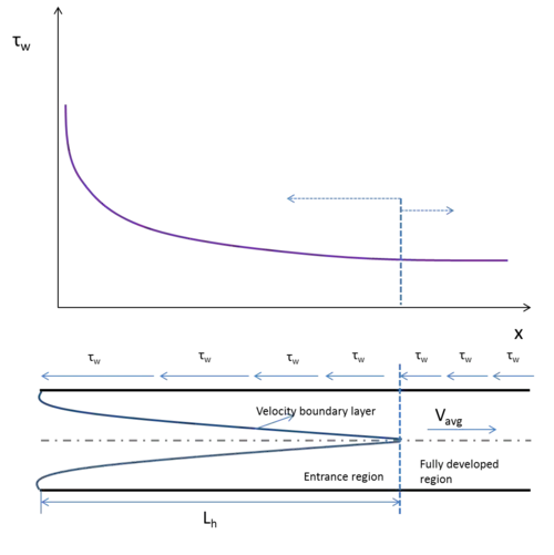 In the hydrodynamic entrance region, the wall shear stress, , is highest at the pipe inlet, where the boundary layer thickness is the smallest. Shear stress decreases along the flow direction.[6] That is why the pressure drop is highest in the entrance region of a pipe, which increases the average friction factor for the whole pipe. This increase in the friction factor is negligible for long pipes.[6] In a fully developed region, the pressure gradient and the shear stress in flow are in balance.[6]